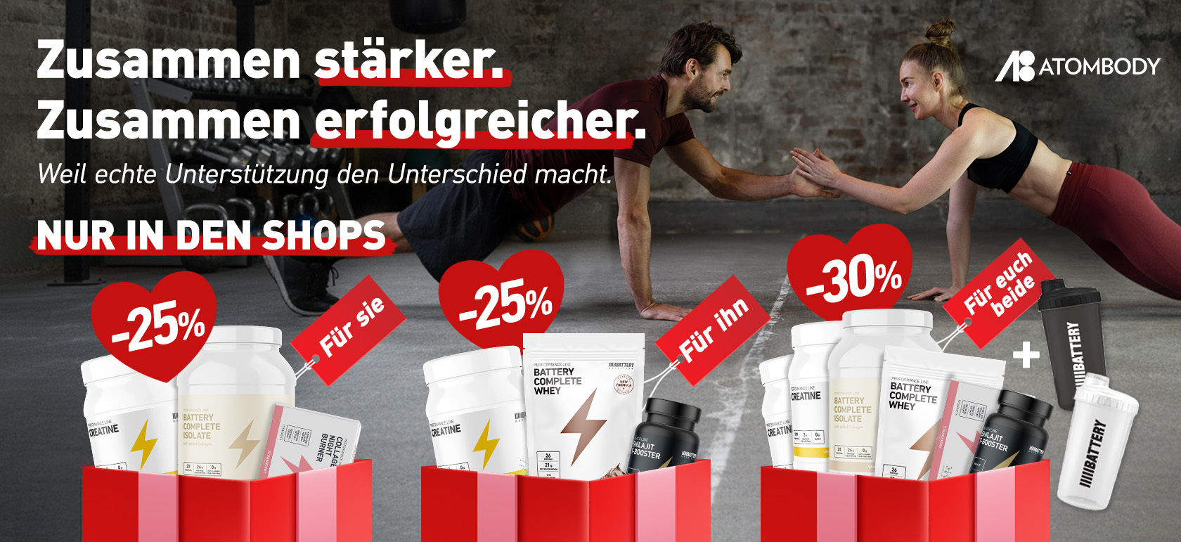 Ein Valentinstagsgeschenk kann weit mehr sein als nur eine symbolische Geste. Es ist eine Gelegenheit, deinem Partner oder deiner Partnerin zu zeigen, dass dir sein oder ihr Wohlbefinden und die persönlichen Ziele wirklich wichtig sind. Ihr Wohlbefinden und ihre Ziele wichtig sind. Genau deshalb haben wir bei Atombody die Valentinskampagne „Gemeinsam zu Zielen“ ins Leben gerufen – inspiriert von der Idee der Couple Goals: Gemeinsam geht es leichter. Und oft auch weiter. Die Valentinsaktion ist exklusiv in ausgewählten Atombody Filialen erhältlich.