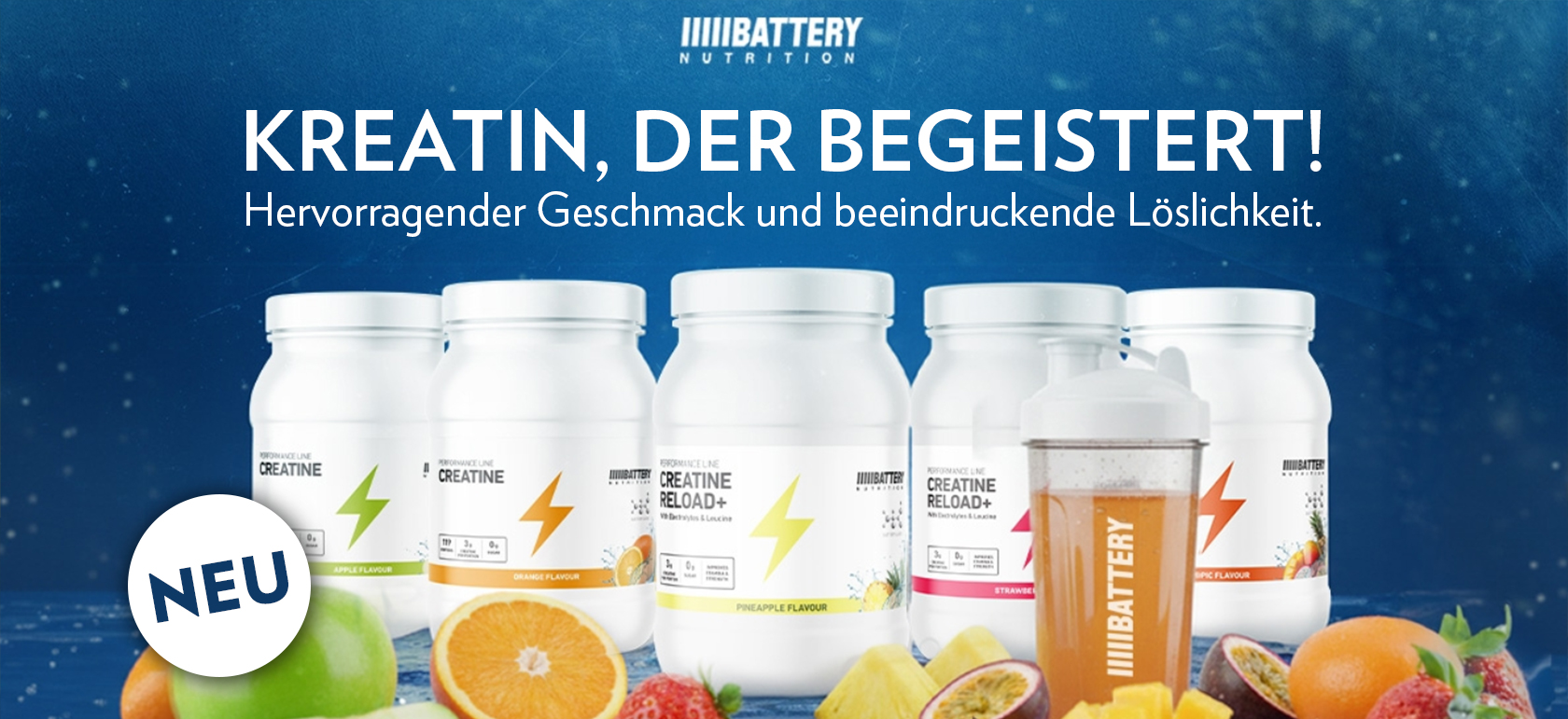 - Battery Creatine Reload+ – eine innovative Mischung aus Kreatin und Elektrolyten für Kraft, Energie und vollständige Hydration.