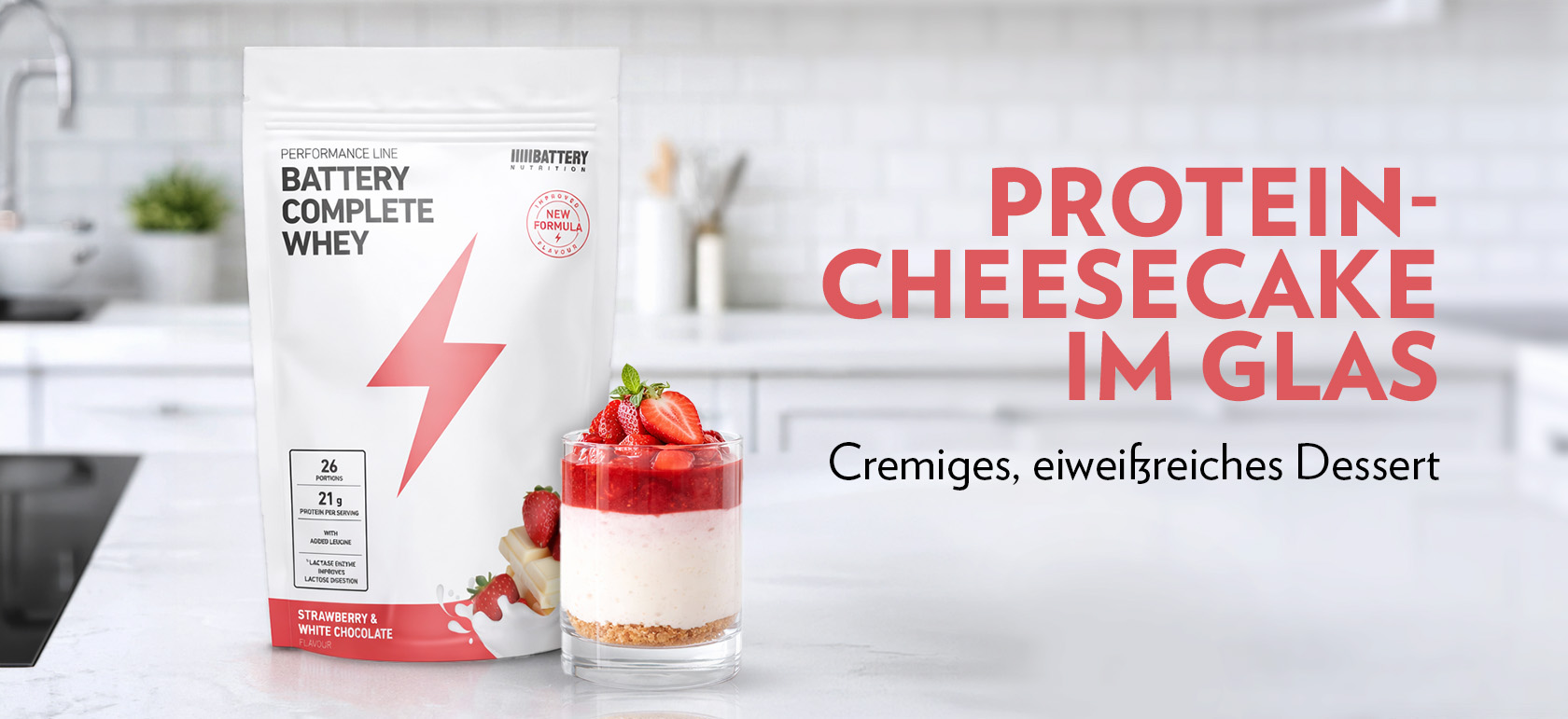 Im Rezept wird eine Portion Battery Complete Whey – Erdbeere und weiße Schokolade verwendet, für einen intensiveren Geschmack und einen höheren Proteingehalt.